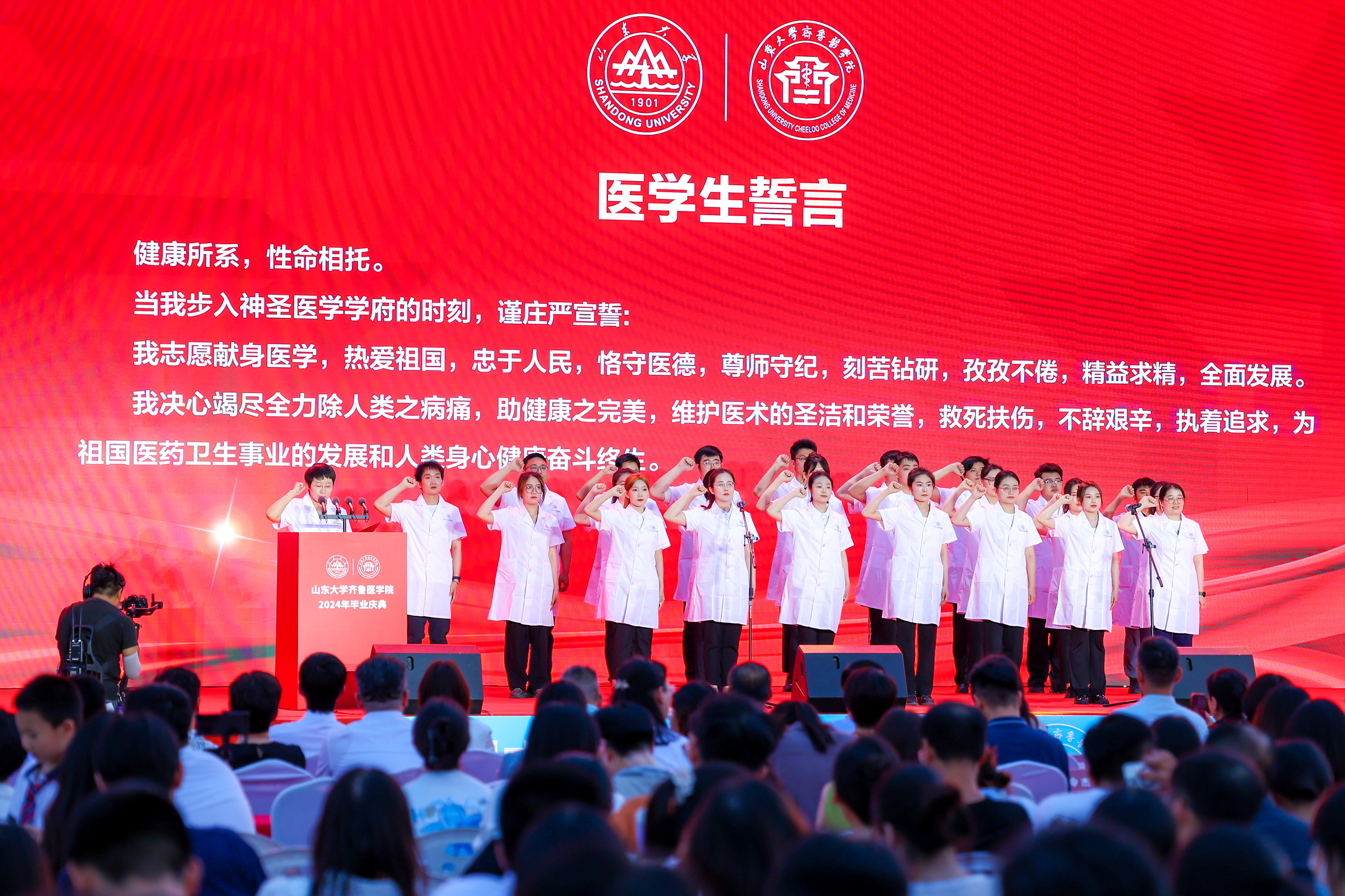 公共卫生学院博士毕业生叶润泽、药学院本科毕业生贾双旭、第一临床学院本科毕业生王俊焱、第二临床学院本科毕业生朱展鹏代表毕业生发言,她(他)们回顾了在齐鲁医学院拼搏的岁月与收获的成长,感悟自己作为青年一代担负的使命与责任,感谢母校的教导和指引让自己蜕变为梦想的模样,勉励毕业生同仁们不负时代、挺膺担当,传递齐鲁医学薪火,续写山东大学荣光!
