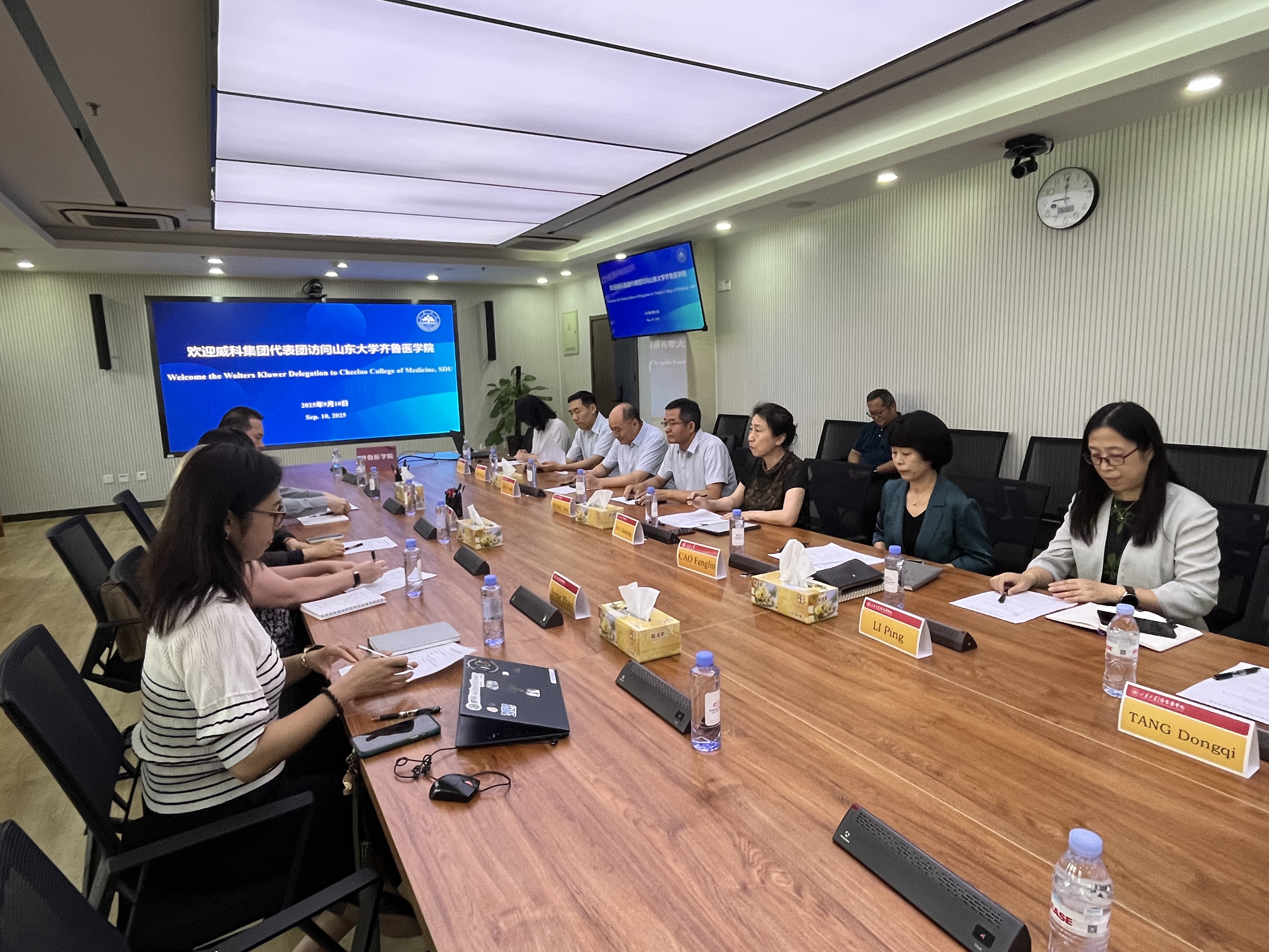 座谈会上,马春红对威科集团的到访表示欢迎,并介绍了齐鲁医学院近年来在科研、教学与国际交流方面取得的成果。威科集团全球增长市场中国区域战略和政府事务副总裁艾星涛介绍威科集团医学领域相关业务,包括uptodate临床决策支持、ovid医学学术检索平台、lippincott医学期刊出版社与数据库等。马春红指出,齐鲁医学院在医学教学、科研与临床领域积累深厚,此次与威科集团交流,希望能在医学学术资源共建共享、医学期刊出版与国际影响力提升两大核心方向深化合作。王涛结合图书馆资源建设实际,就学术数据库合作、数字资源服务等问题与对方探讨合作可能。随后,与会代表就医学期刊建设、开放获取出版、学术评审标准、国际合作项目等议题进行了深入交流。威科集团表示将继续支持山东大学在医学期刊国际化、学者培训、高影响力论文推广等方面的努力,共同推动中外医学学术交流。此次访问进一步巩固了威科集团与山东大学的合作关系,为未来在医学出版、科研评价、学术活动等方面的深度合作奠定了坚实基础。