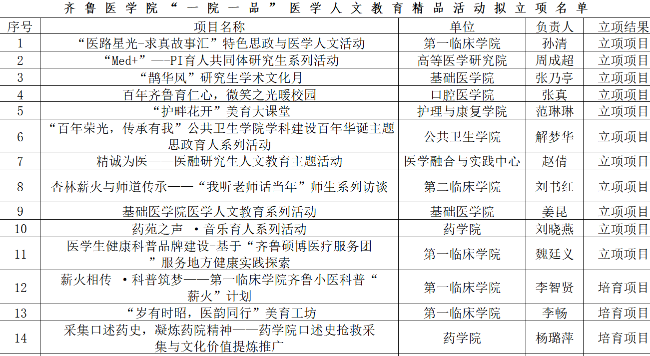 根据《关于山东大学齐鲁医学院“一院一品”医学人文教育精品活动2023年度项目结项和2025年度项目立项工作的通知》要求,经项目申报答辩、专家评审,确定14项2025年度山东大学齐鲁医学院“一院一品”医学人文教育精品活动项目拟立项,其中11项立项项目,3项培育项目,现公布拟立项名单如下: