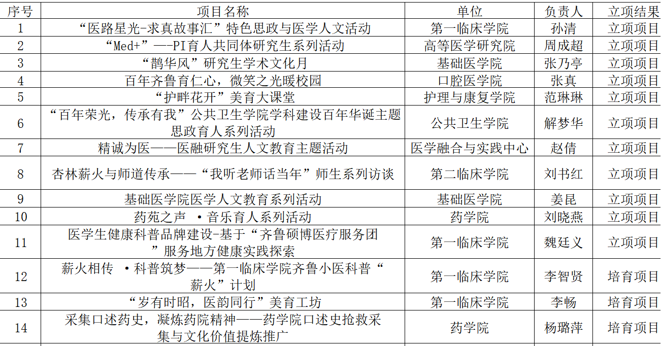 根据《关于山东大学齐鲁医学院“一院一品”医学人文教育精品活动2023年度项目结项和2025年度项目立项工作的通知》要求,经项目申报答辩、专家评审、公示,确定14项2025年度山东大学齐鲁医学院“一院一品”医学人文教育精品活动项目立项,其中11项立项项目,3项培育项目,现公布立项名单,有关事项通知如下: